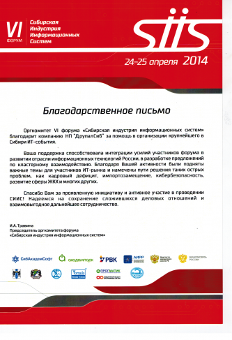 НП “ДрупалСиб” получило благодарственное письмо от Форума Сибирская Индустрия информационных систем за помощь в организации крупнейшего IT-события Сибири и вклад в развитие отрасли информационных технологий в России.